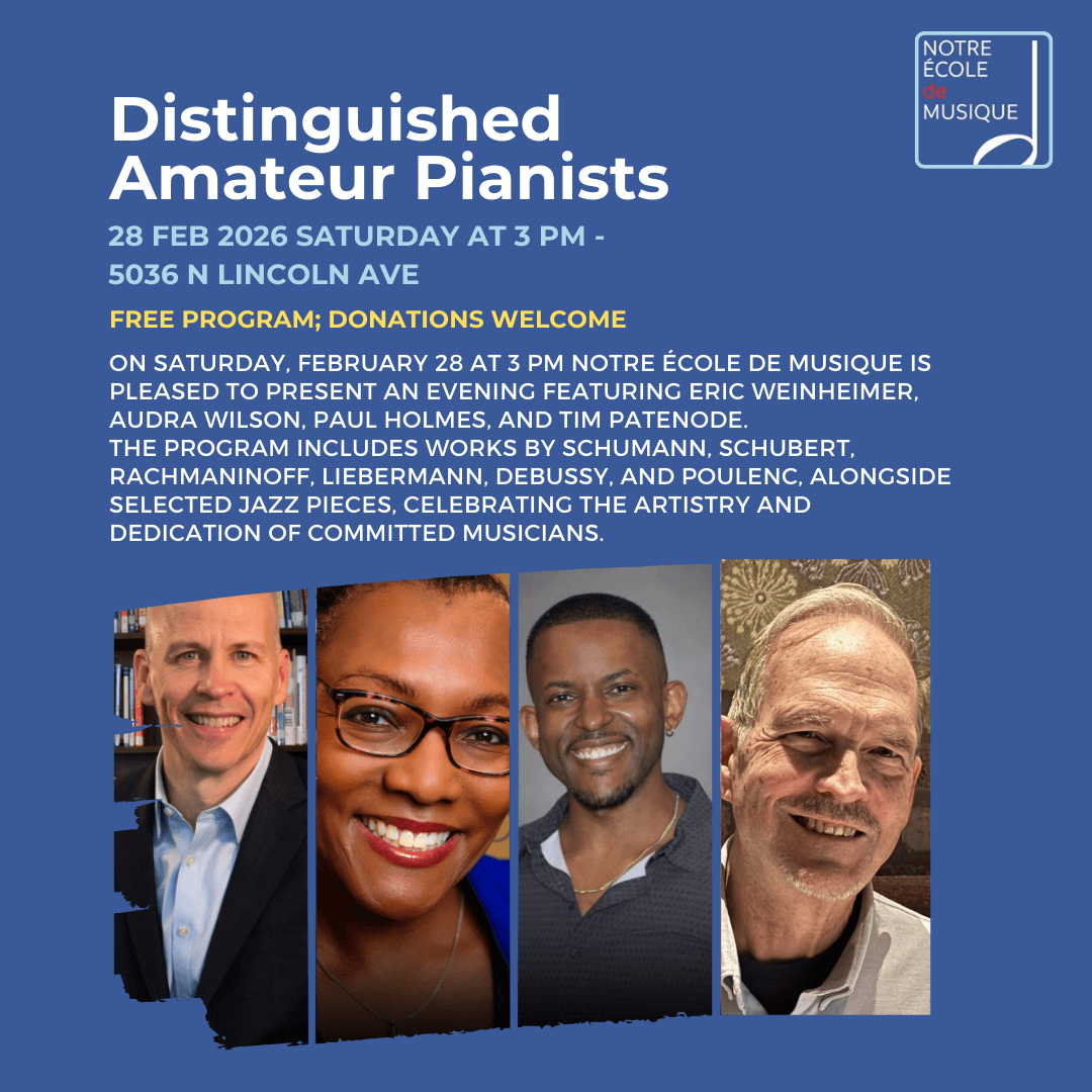 On Saturday, February 28 at 3 PM Notre École de Musique is pleased to present an evening featuring Eric Weinheimer, Audra Wilson, Paul Holmes, and Tim Patenode. The program includes works by Schumann, Schubert, Rachmaninoff, Liebermann, Debussy, and Poulenc, alongside selected jazz pieces, celebrating the artistry and dedication of committed musicians.